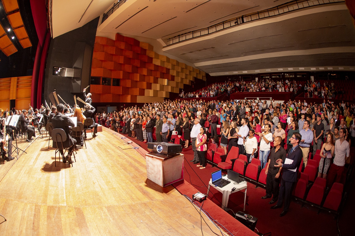 Fiquemos agora com a apresentação da Orquestra Sinfônica e Coral da UFS para coroar essa noite de homenagens e honrarias, dignificando a presença de cada um dos que aqui se encontram”.