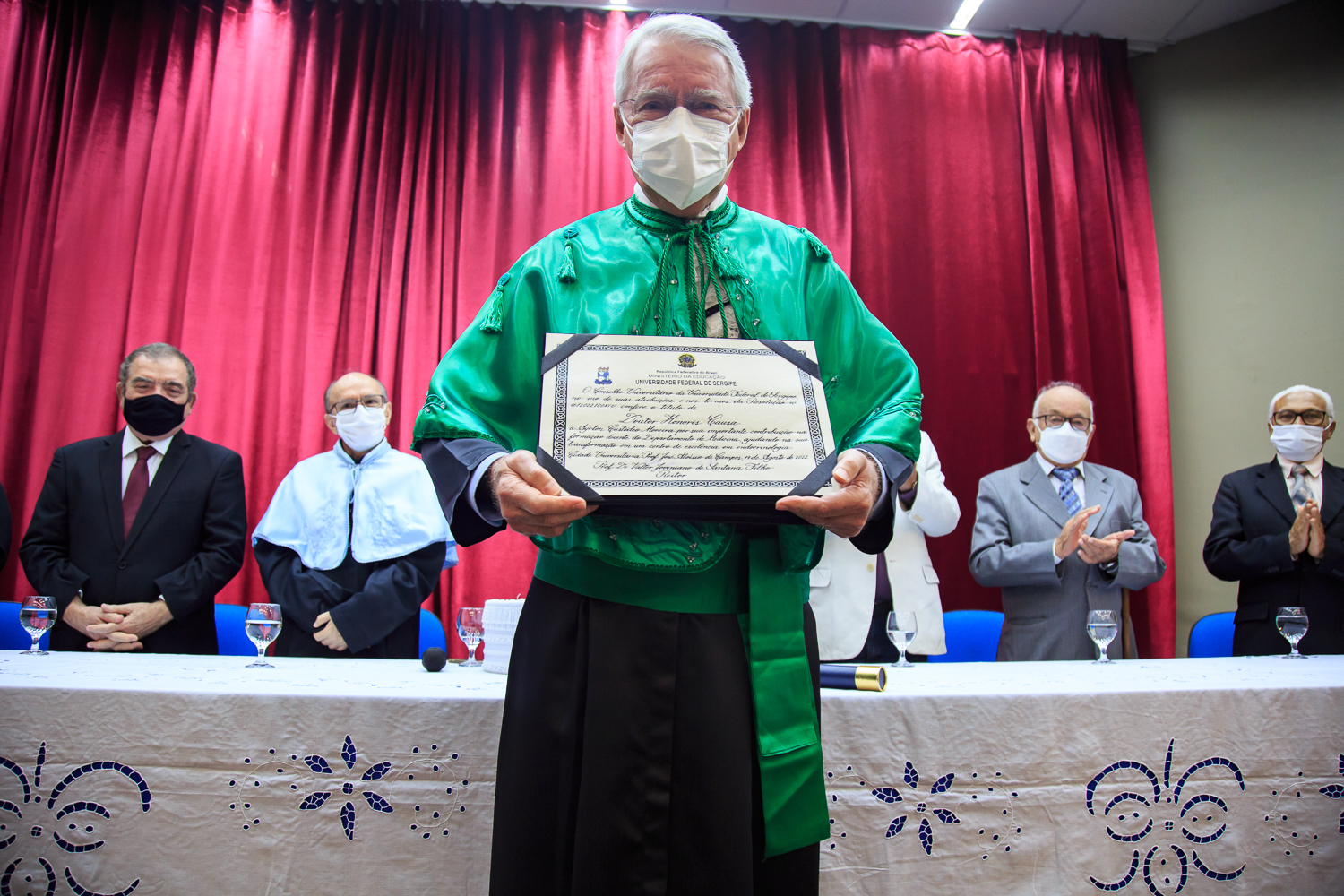 O título foi entregue em sessão solene dos conselhos superiores na noite desta sexta-feira, 19, no Auditório Libório Firmo, com a presença de gestores da UFS, ex-reitores, professores, amigos e familiares do homenageado. A concessão foi aprovada por unanimidade pelo Conselho Universitário (Consu), por meio da Portaria 16/2022, após proposta do Conselho Departamental de Medicina.